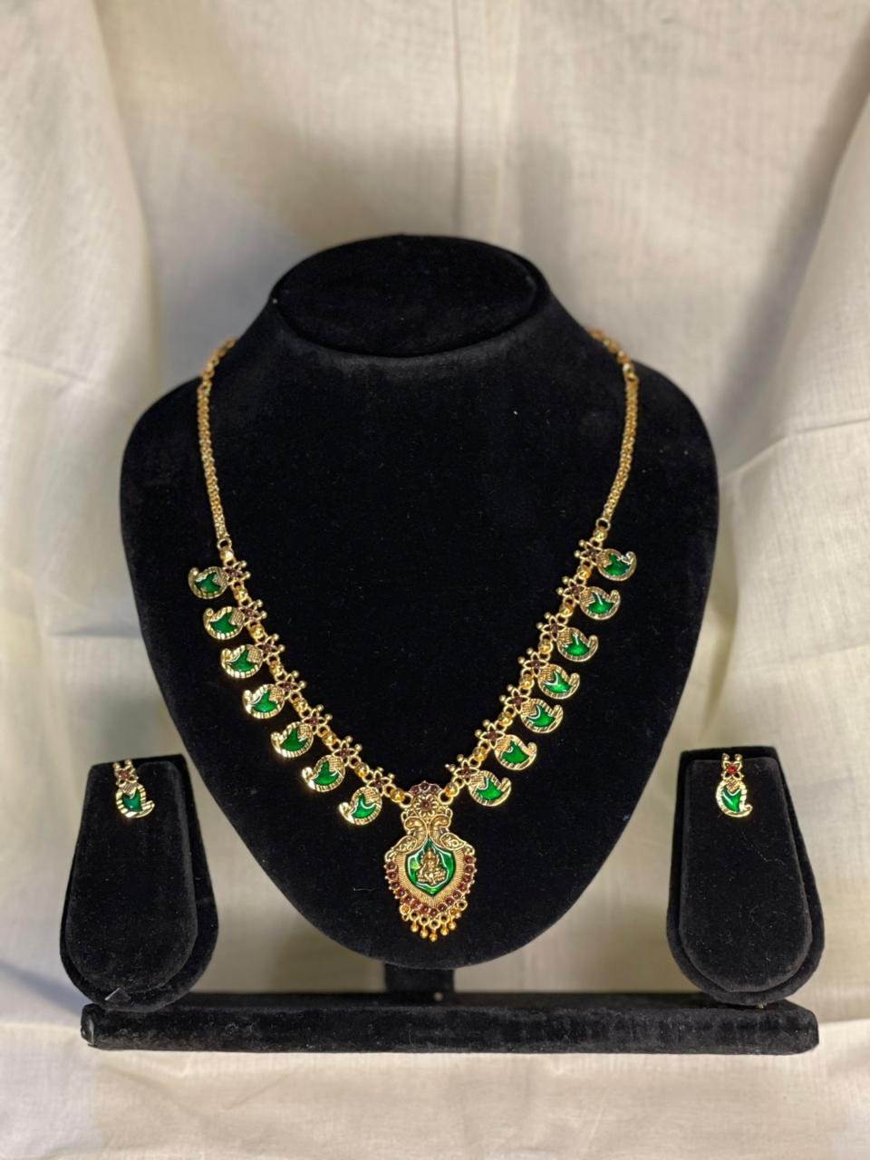 Enhance your traditional look with this elegant Mango Design Necklace Set with Stud in green stone finish. Crafted with premium quality imitation gold polish, this set is perfect for weddings, festivals, and special occasions.